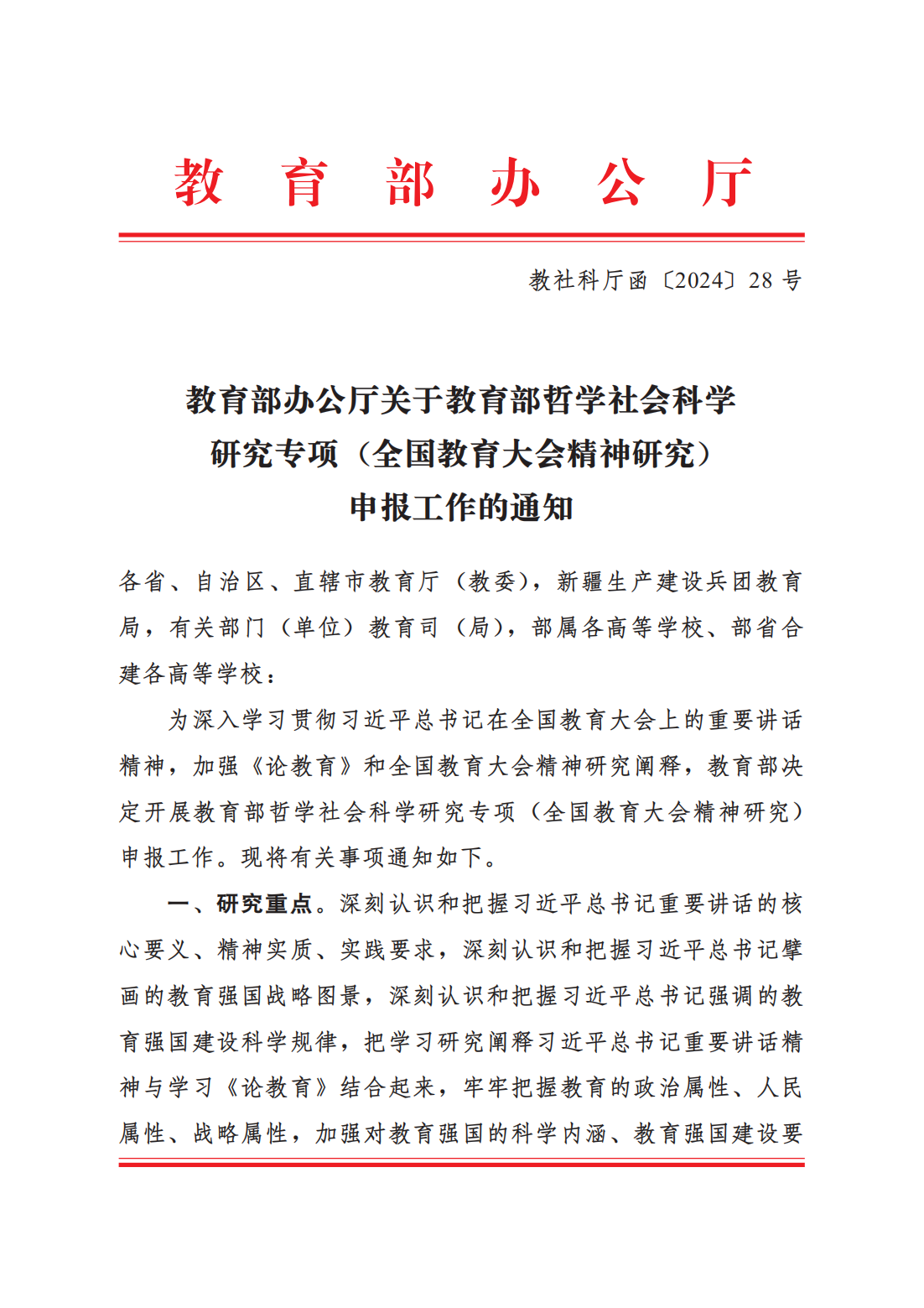 (转发)教育部社科专项(教育大会精神)申报通知(资助5万)